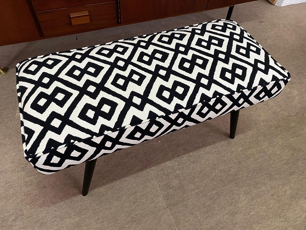 BANQUETA EM TECIDO PRETO E BRANCO E PERNAS LACADAS EM PRETO