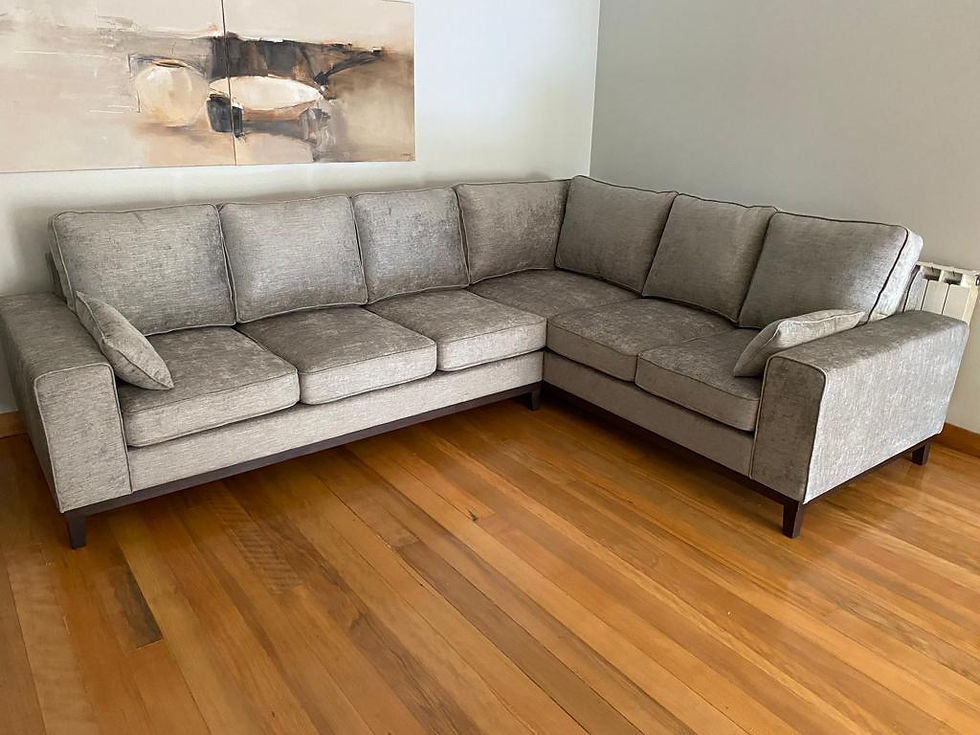 SOFÁ DE CANTO COM RODAPÉ EM WENGUE E TECIDO CINZA